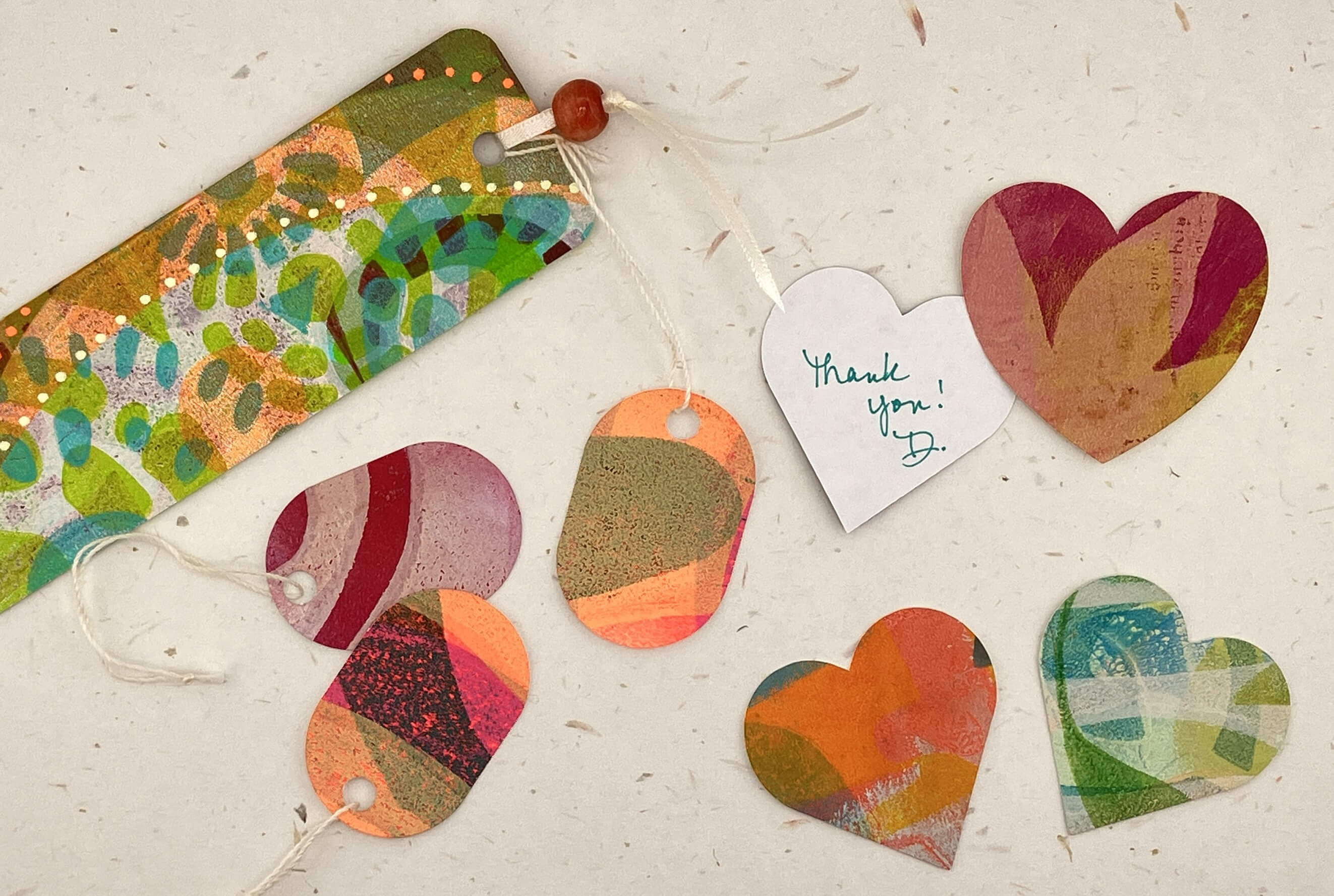 I save mine in a folder until I need to create price tags for my work—especially bookmarks for Collective Arts Gallery here in Hot Springs. Sometimes I make heart-shaped thank you notes to include in print or stencil orders.