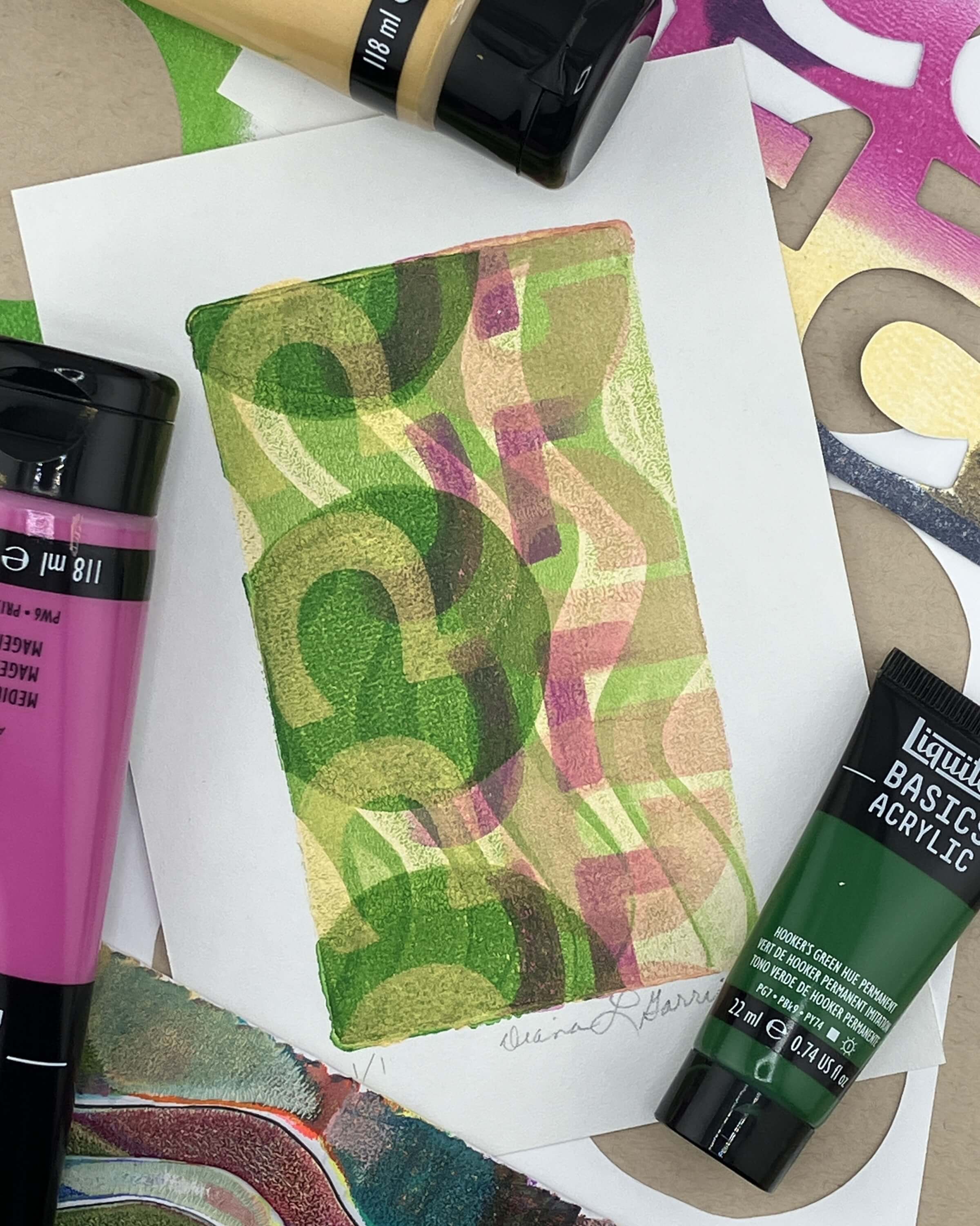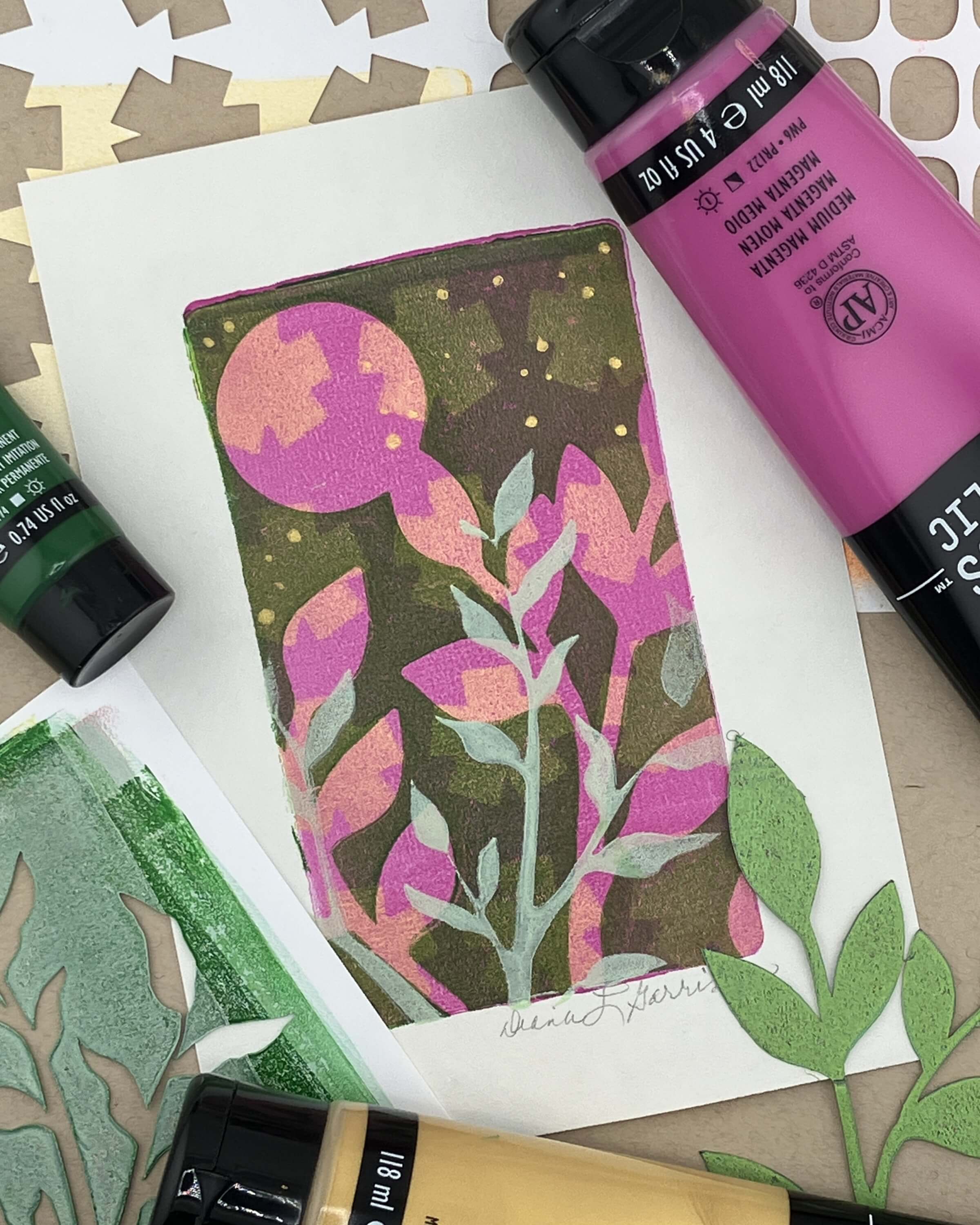 For the second layer, I rolled out medium magenta and pressed plastic packaging material into the wet paint. The plastic lifted away most of the magenta where it touched, so when that layer printed over the green, it created a really rich purple with bits of green still showing through. You could get a similar effect using texture stamps as well.